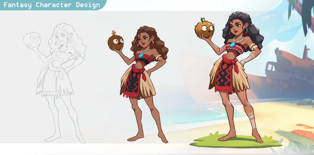 1. Conceptual Development: Before the actual design process begins, we work with clients to understand their creative vision. This includes determining the character’s role, personality, and backstory, which informs the visual style and overall design direction.